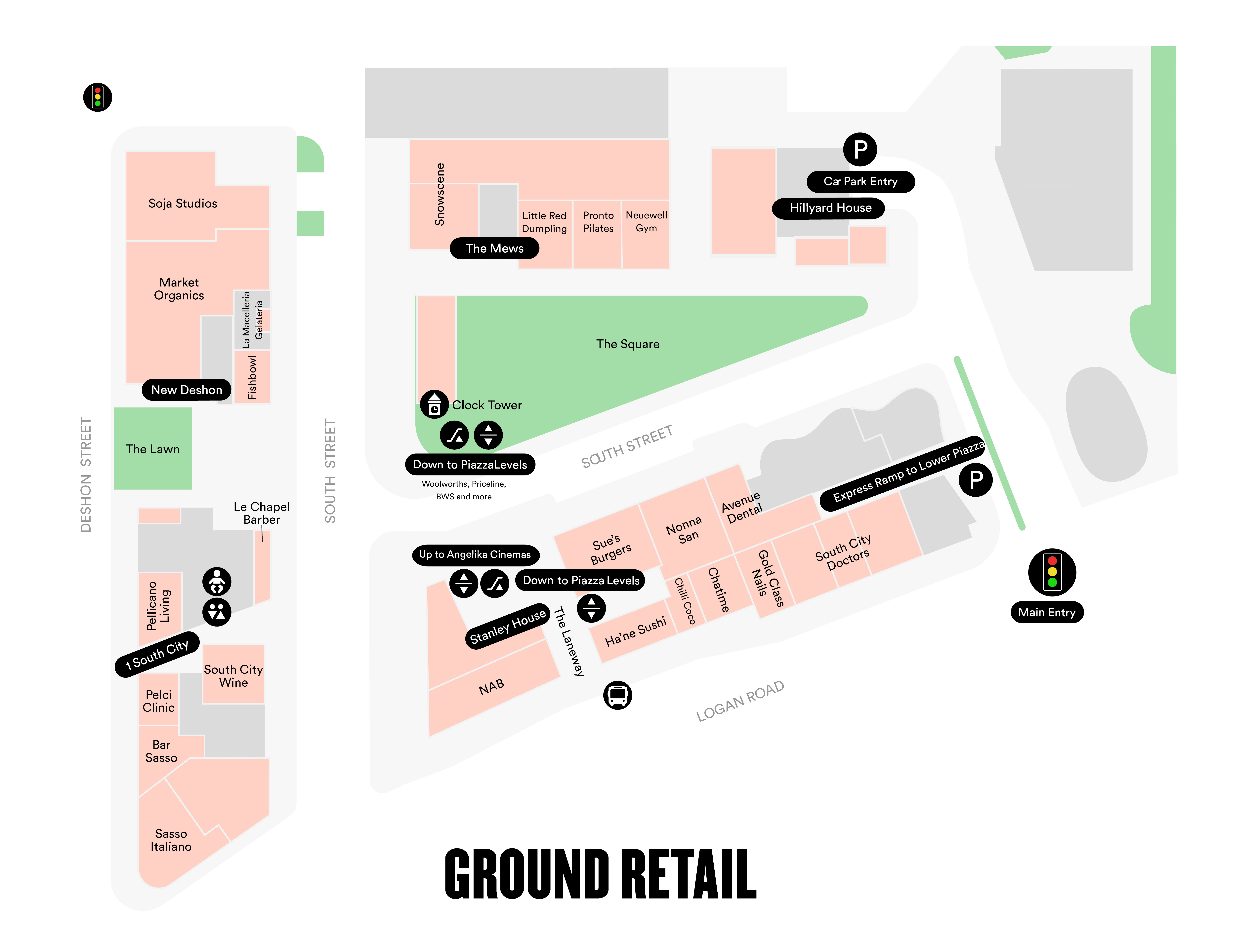 South/City/SQ is dedicated to ensuring accessibility for all visitors. Lifts, travellators and escalators are stationed around South/City/SQ to allow access to all areas of the precinct. South/City/SQ also accommodates young families during their visit. A full parents room with baby change stations can be found next to the restrooms on Upper Piazza. An additional baby change station is also available in the disabled toilet on Ground.